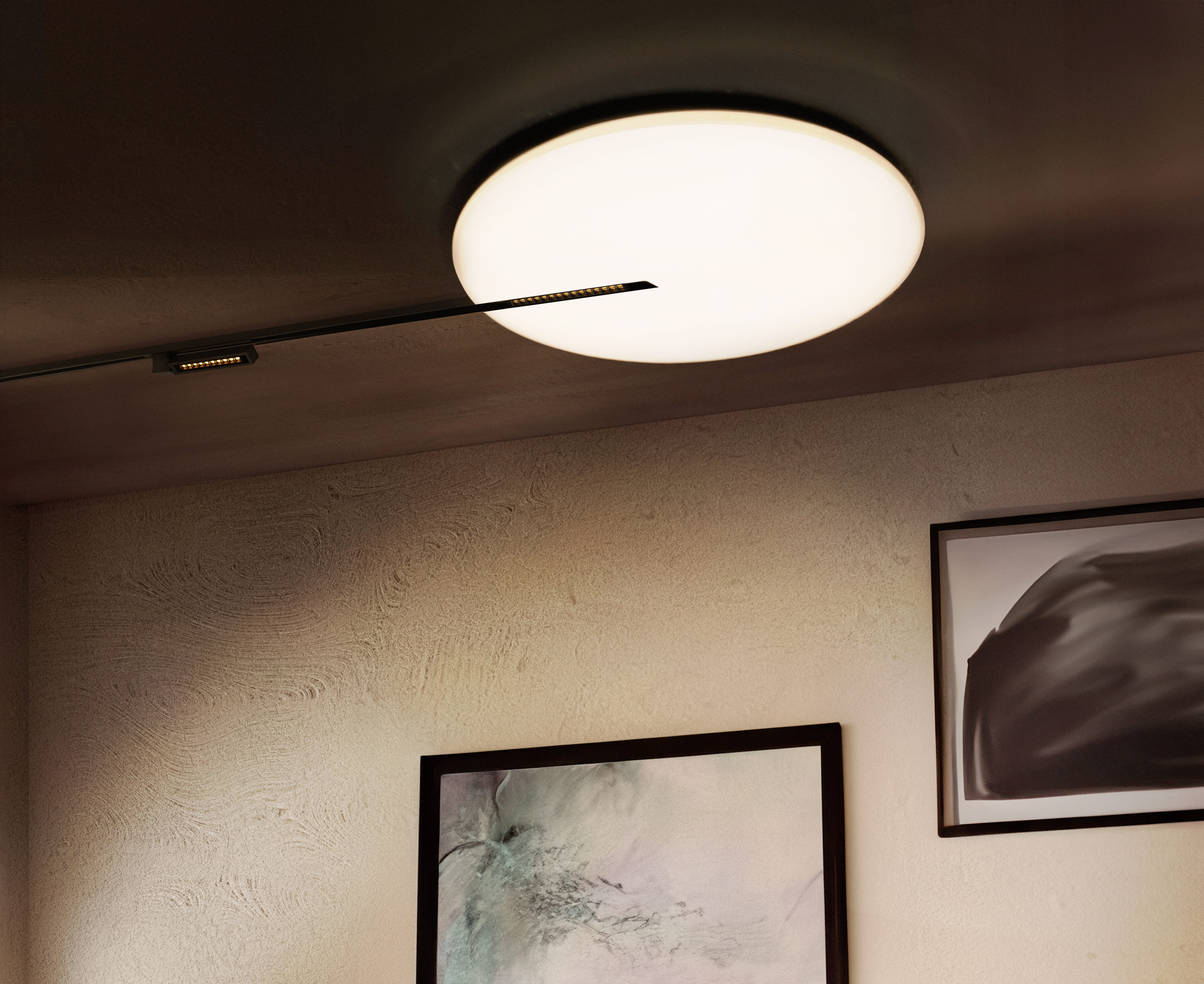 Unisce la versatilità del binario elettrificato alla luce diffusa e architettura del pannello led: propone al mercato un nuovo strumento per illuminare qualsiasi spazio con pochi punti luce ed un segno grafico inedito.