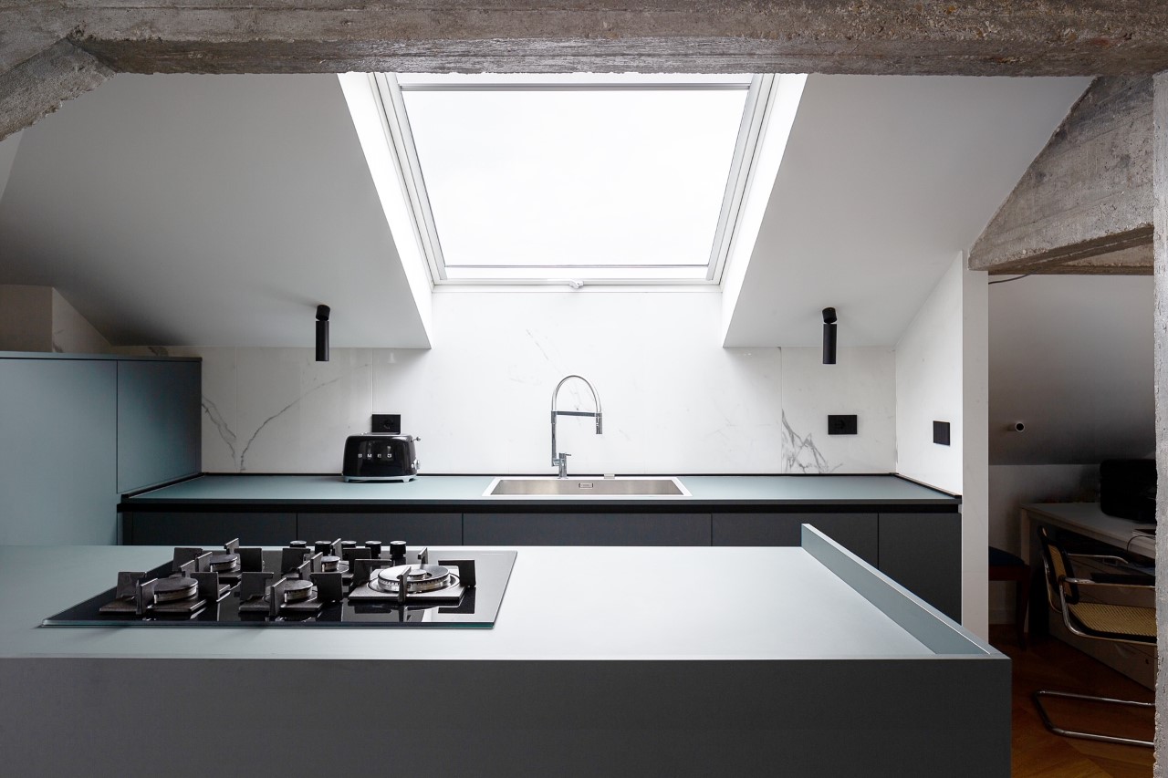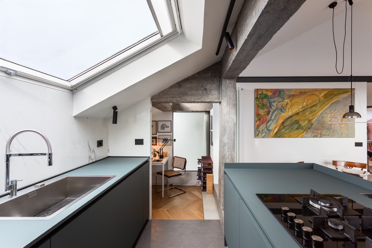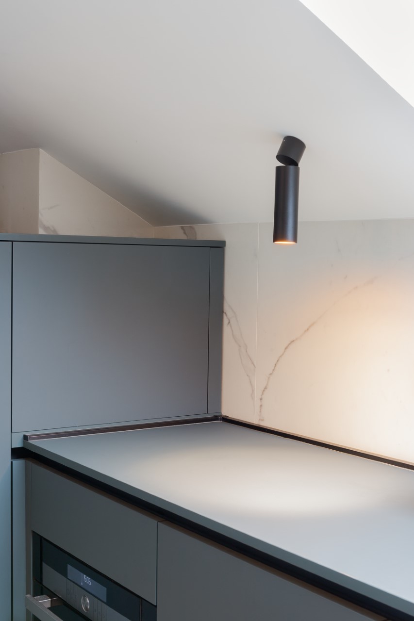 Le soluzioni illuminotecniche utilizzate hanno permesso di valorizzare ogni angolo dell’appartamento. Nello specifico i proiettori Miniperfetto MM a binario ed il Miniperfetto Base, applicato elegantemente nella parte spiovente del tetto della cucina, forniscono il giusto grado di luce d’accento in parti dell’abitazione dove, per la conformazione della stessa, è meno presente la luce naturale.
