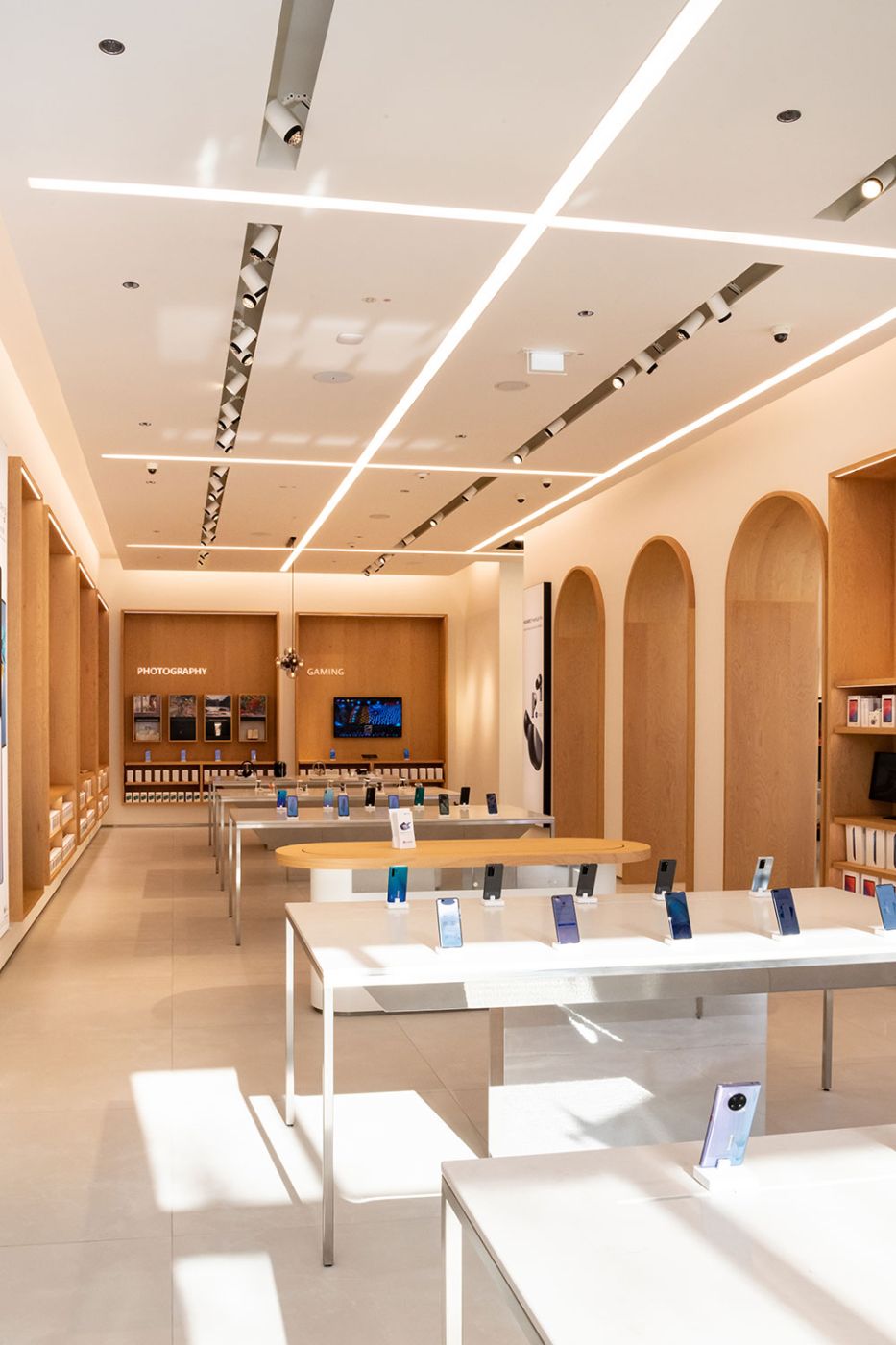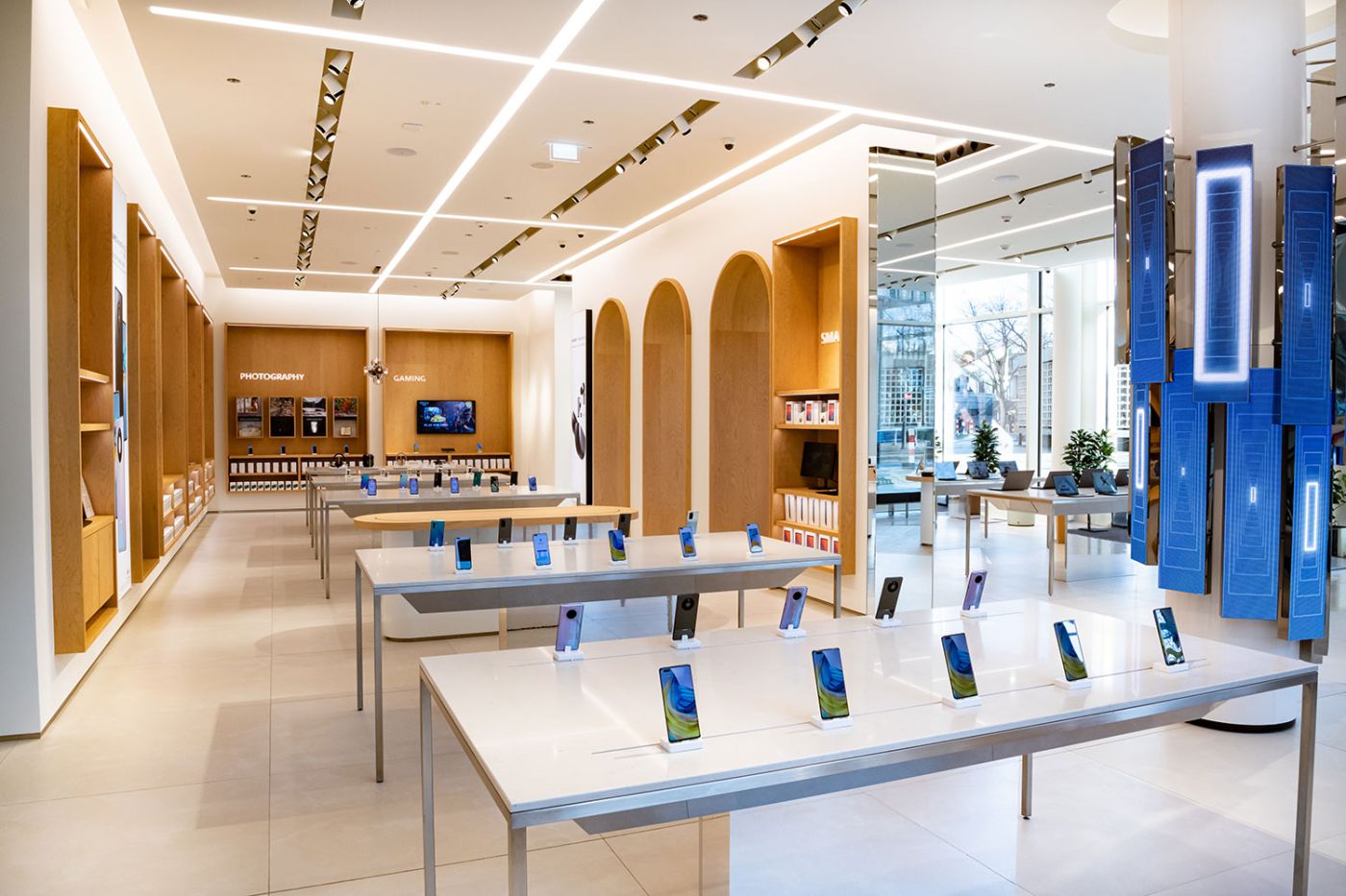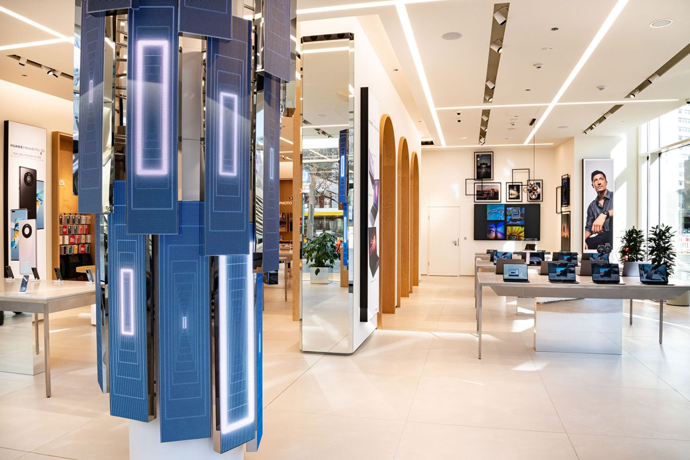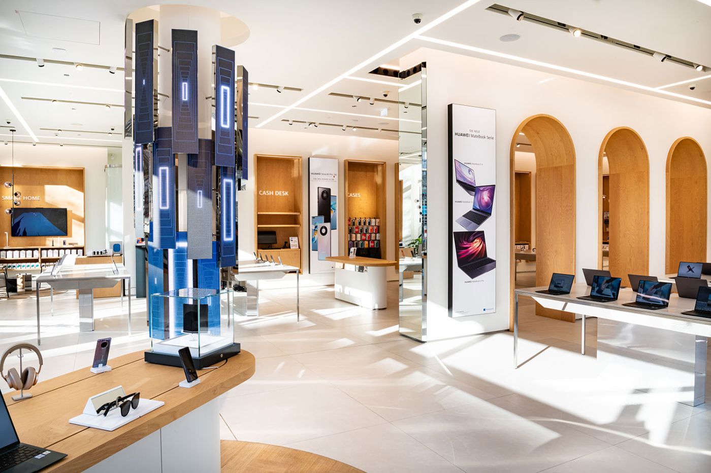 Il nuovo store Huawei di Berlino è un affascinante mix di eleganza e tecnologia. Inserti in legno, archi e colore bianco sono gli elementi principali, e caratteristici, della location.