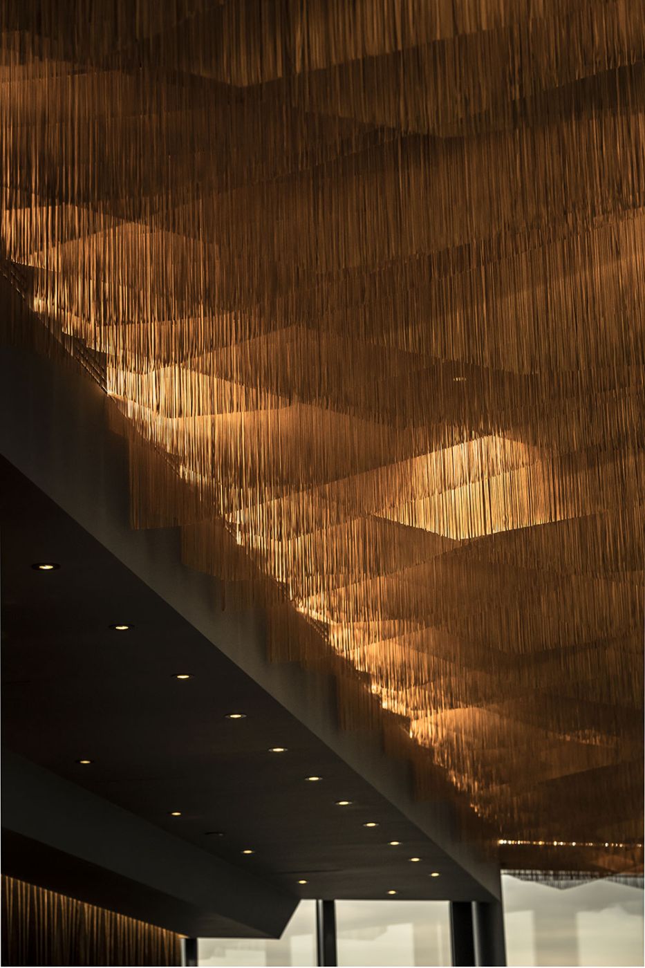 Un'installazione a soffitto composta di fili d'oro corre lungo il lato della finestra. Profili di luce bianca dinamica li illuminano, di luce più fredda durante il giorno, e calda la sera.