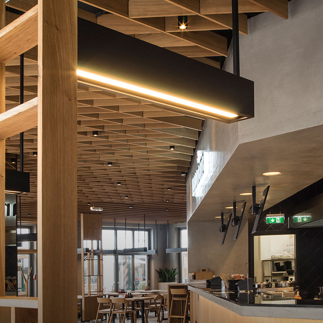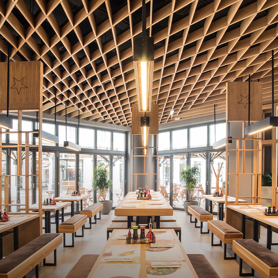 L’uso del legno è alla base dello sviluppo progettuale del nuovo ristorante Wagamama di Parndorf, in Austria.